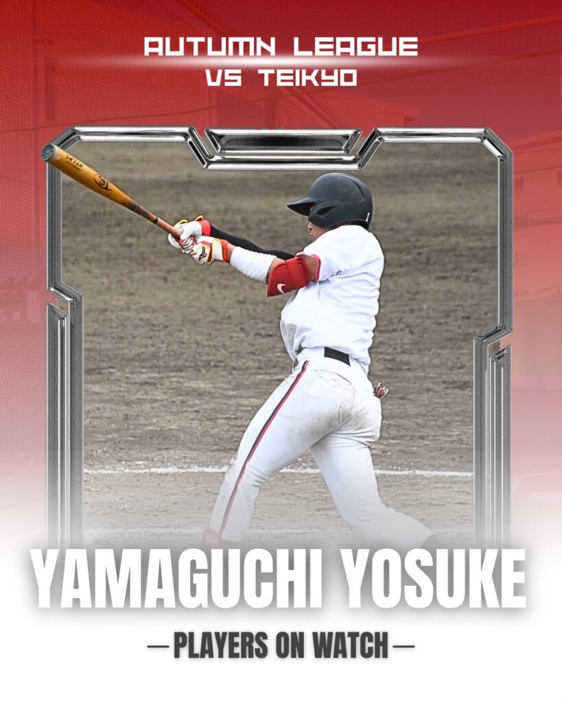 →今秋季リーグ戦、グラウンドの中央を守るのは山口瑶介と井上開斗の二遊間コンビ。息の合ったコンビネーションと堅実な守備で、チームの守備を支えます。さらに、山口は試合を重ねるにつれ調子を上げ、現在の打率は.300とチーム1の打率を誇ります。フレッシュさを忘れない、ハツラツとしたプレーで攻守にわたって躍動する彼の活躍にぜひご期待ください!